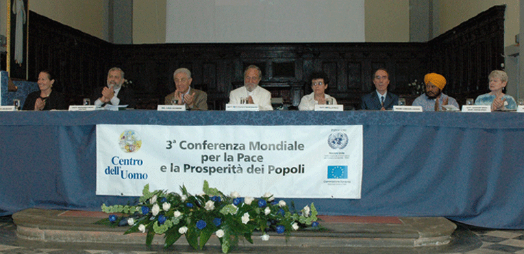 - In dieser Funktion leitete er als Vorsitzender die drei Weltkonferenzen für Frieden und Wohlstand der Nationen 1999, 2002 und 2005 mit Delegierten aus fünf Kontinenten sowie hochrangigen religiösen und politischen Vertretern unter der Schirmherrschaft der Italienischen Ratspräsidentschaft, der Europäischen Kommission und der Vereinten Nationen (U.N.).